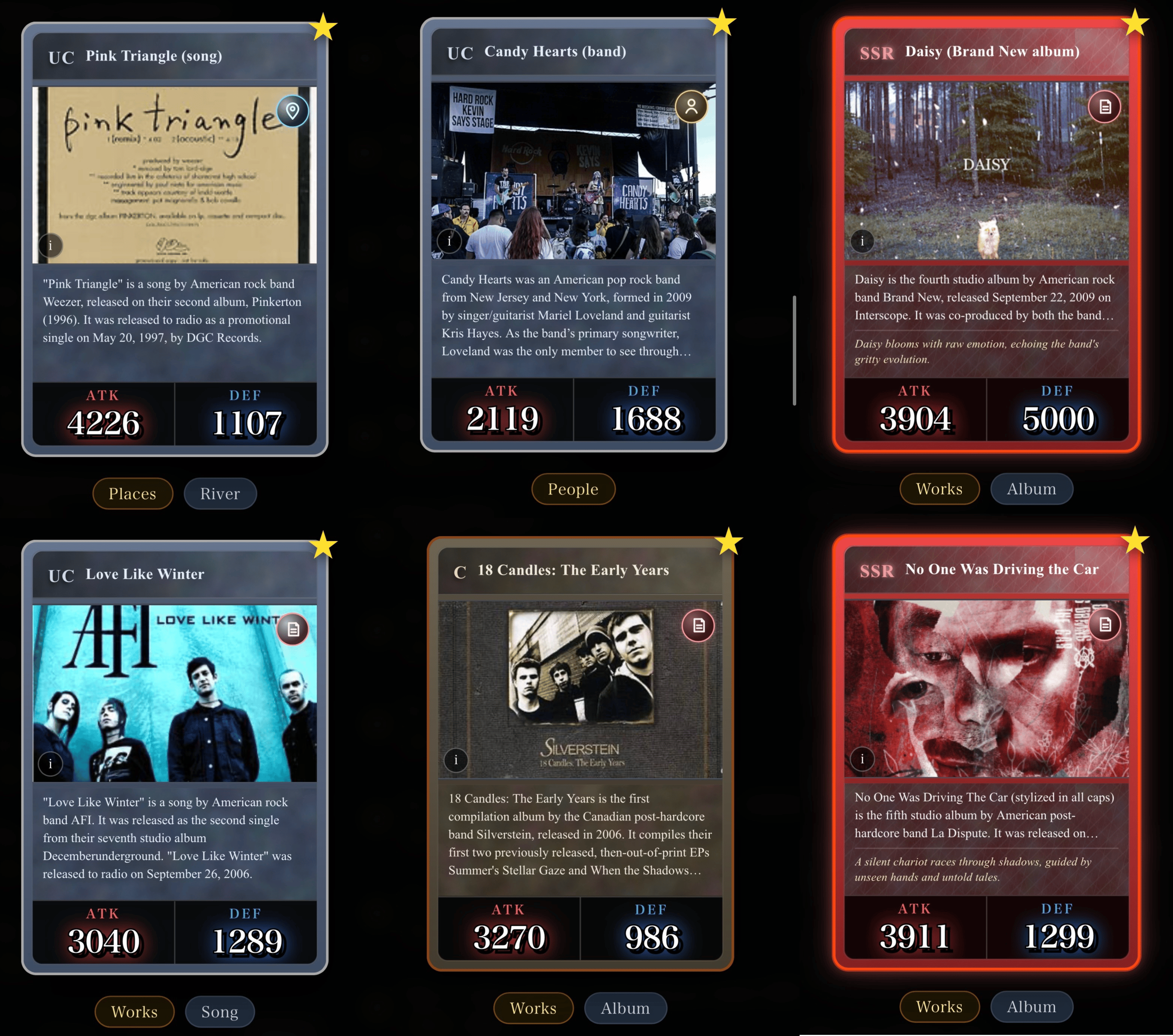Clockwise from top left: a Weezer song, Candy Hearts, a Brand New album, a La Dispute album, a compilation from Silverstein, an AFI song,