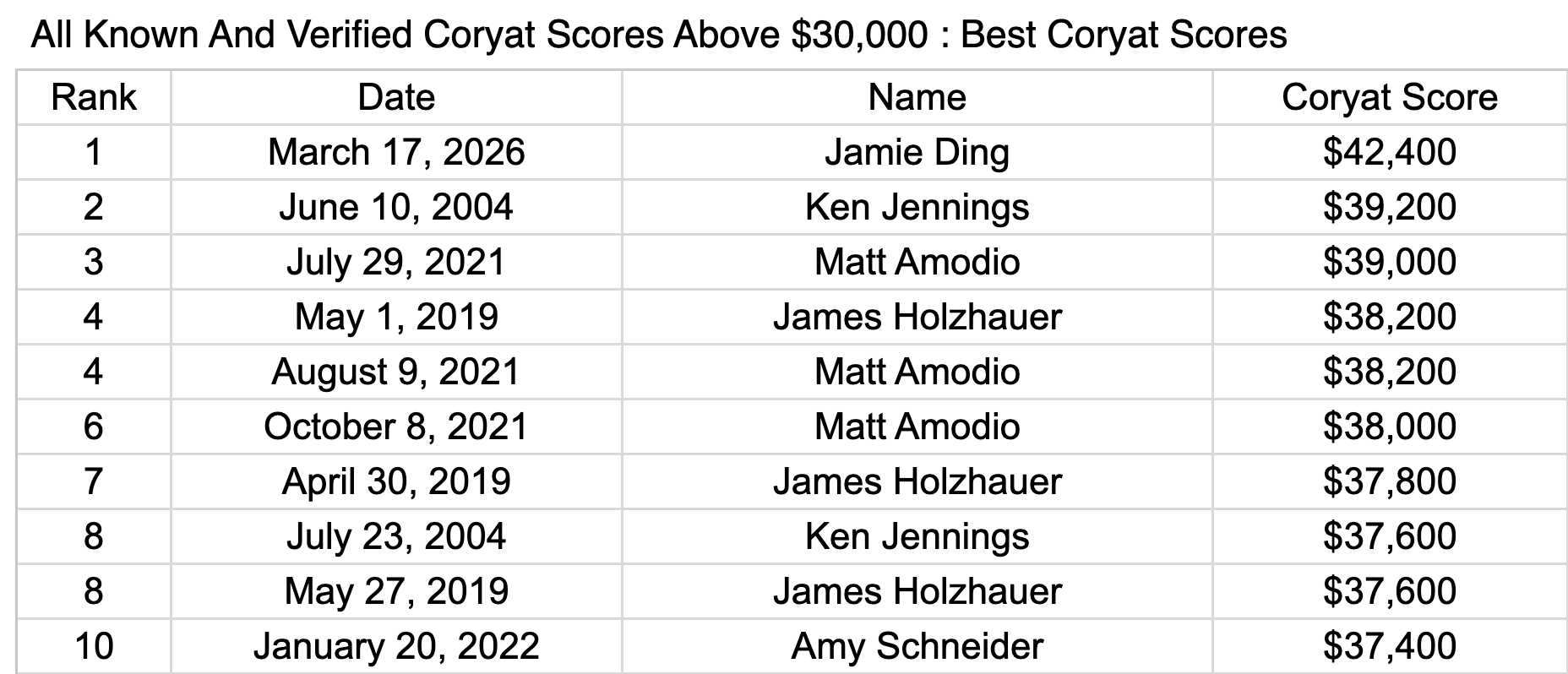 The top 10 Coryat scores of all time, via thejeopardyfan.com: